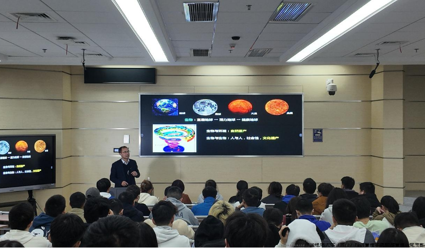 授课伊始,谢院士以生动的语言和丰富的图片资料,将同学们带入了地球生物演化的历史长河。从地质时期的生物霸主更迭,到古人类的起源与迁徙,再到四大古文明的诞生与兴衰,最后到盖亚假说和地球的安全运行空间,谢院士不仅用科学的视角解读了人类文明与自然环境之间的深刻联系,更融入了对中华文明连续性与发展的深刻思考。他指出,中华文明是四大古文明中唯一连续发展、没有中断的文明,这得益于其独特的地理环境和文化韧性。因此,他也强调了地球科学与人文社科融合的重要性,只有两者相辅相成,才能更好地揭示人类文明的奥秘。