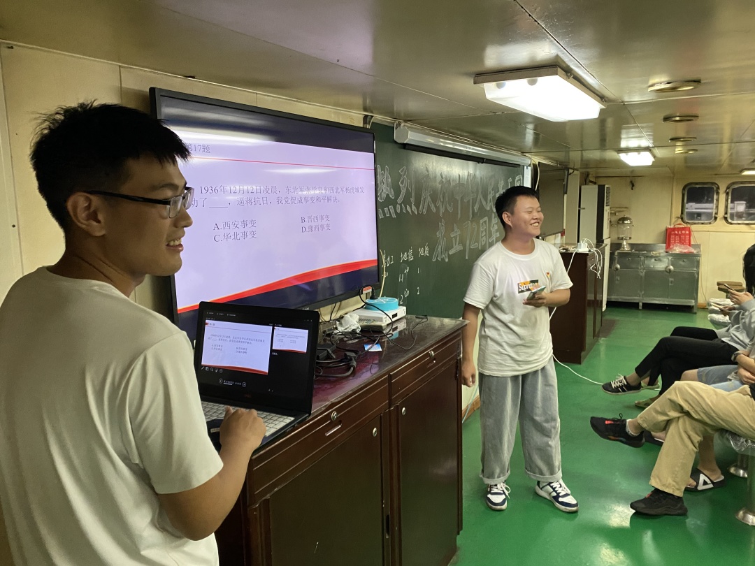 10月1日晚上7点,学院全体师生在“东方红2”船的多功能厅举行“忆四史 梦深蓝——‘四史’与海洋科学趣味知识竞赛”活动。