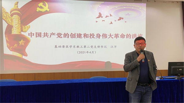 汪洋教授以“中国共产党的创建和投身伟大革命的洪流”为主题,从近代中国先辈们为了民族复兴如何奋起反抗说起,重点介绍了五四运动的经过、影响以及时代意义和内涵,由此延伸到中国共产党早期组织的建立过程以及从中共一大至中共五大这五次会议的相关内容及历史意义,详细为师生党员阐明了为什么只有共产党才能建立新中国这一观点。他鼓励师生党员要学好党的历史,深刻铭记党百年奋斗的艰苦历程,感悟党矢志不渝为人民的初心宗旨,继承和发扬五四精神和革命精神,坚定理想信念,练就过硬本领,作为动物医学专业的师生,要“知农爱农”并以“强农兴农”为己任,为实现第二个百年奋斗目标而接续奋斗。