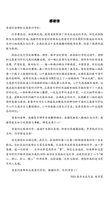 “说一声感谢,道一句珍重……当毕业季变成毕业‘寄’,即使无法返校,但老师和同学们不辞辛苦地为我们收拾打包行李,让我们收获了一个‘贴心、安心、放心、暖心’的毕业季,这份温暖、关怀与感动,将陪伴我们走过漫长的人生路……”千言万语化为一封《感谢信》,浓浓的师生情洋溢于纸面,将毕业生的真诚感谢传递到老师们的身边。