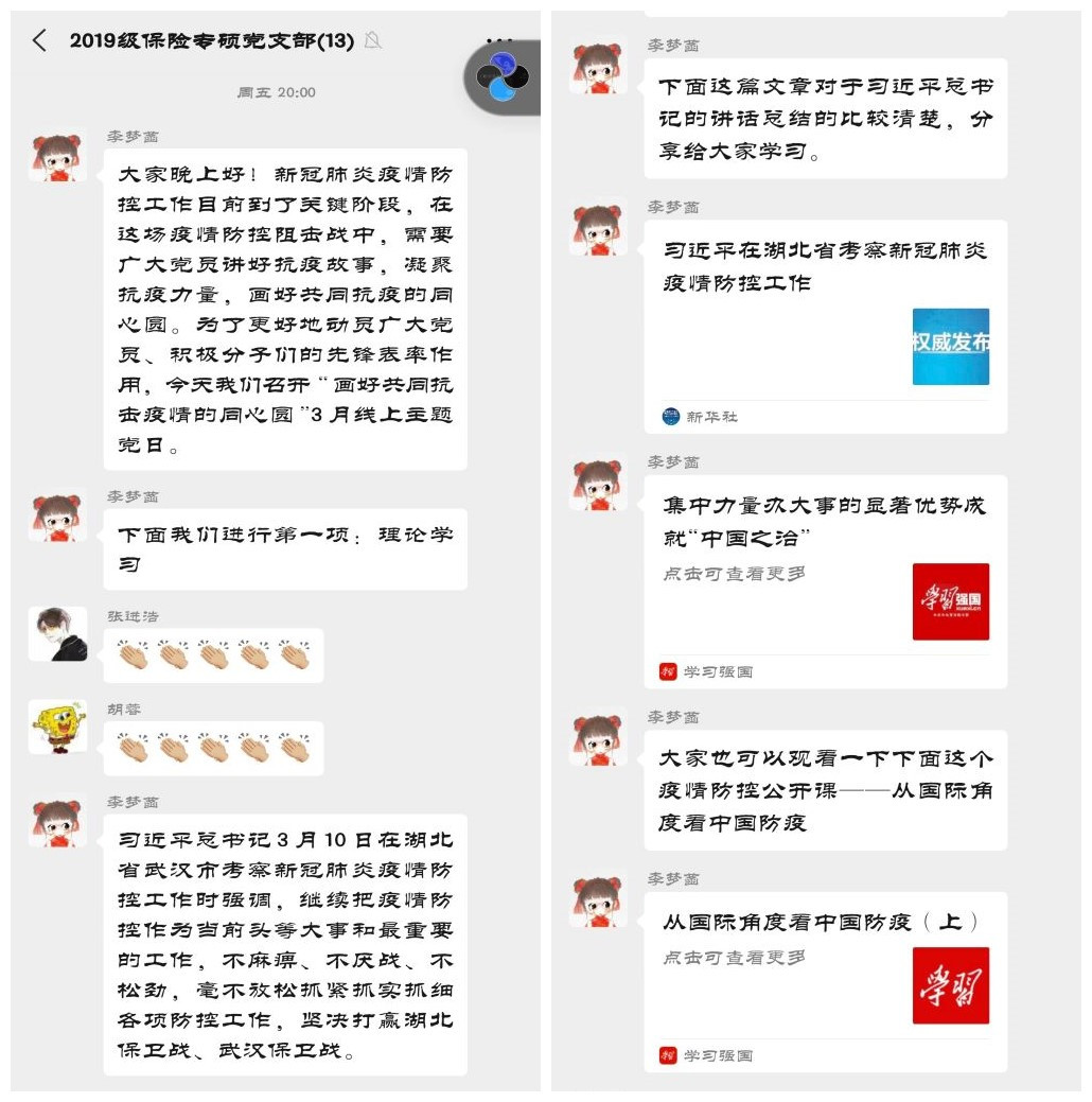 为更好地学习疫情防控相关知识,发挥广大党员在疫情防控阻击战中的先锋模范作用,2019级保险专硕党支部于3月12日晚8点在支部微信群开展“画好共同抗疫情的同心圆”3月线上主题党日活动。全体党员和积极分子签到、参与学习并进行了积极讨论,在抗击疫情的决胜时期,大家认真学习了习近平总书记在湖北考察时的讲话,并结合抗疫公开课和身边的抗疫故事分享了自己的心得体会。