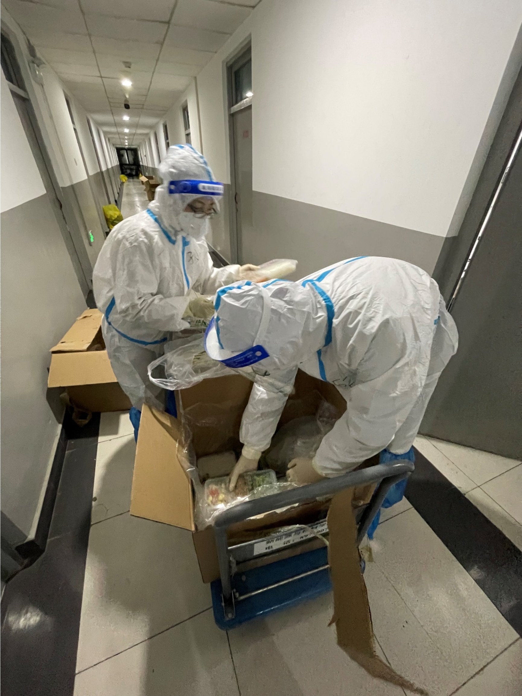 ===突击队员们不停地忙碌,无论白日还是黑夜,把一份份温暖送到隔离学生手中===