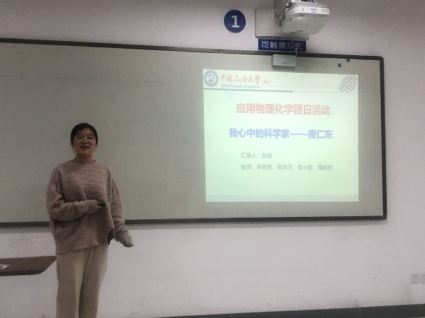 活动前夕,贾寒就以项目小组的形式为大家布置这项素质训练“作业”,准备过程中,小组成员从素材收集、演讲展示、课件制作进行分工,五位成员密切配合,最终各小组分别介绍了郭永怀、杨世铭、邓稼先、于敏、南仁东等五位杰出科学家的爱国奉献事迹,通过演讲表述传递他们身上的科学精神和爱国品质。从郭永怀先生坠机时与助手保护科研资料,到邓稼先先生第一时间无防护进入核爆现场获取相关资料,再到南仁东先生为了“中国天眼”四处奔走呼吁,这些细节感动着在场的每一位师生。五位同学演讲后,全体同学投票选出了优秀作品奖,贾寒和单珣为获奖同学颁奖。