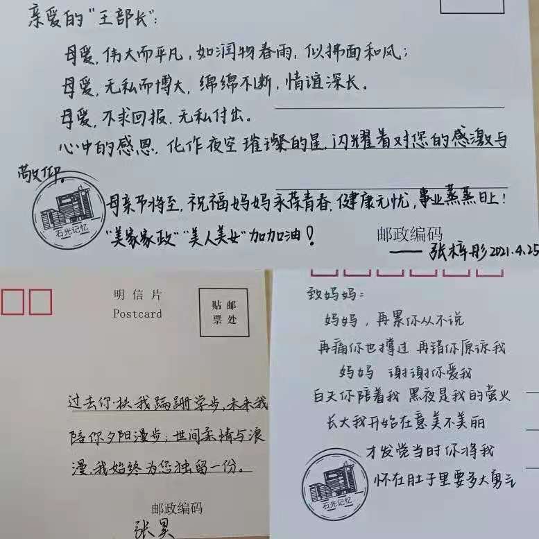 “妈妈,谢谢你爱我,白天你陪着我,黑夜是我的萤火。”纸端的文字传递着温情的爱,石工学院心理工作站倡议大家在贺卡上写下对母亲的祝福,组织征集妈妈们的青春影像,“这张照片让我感觉到妈妈年轻的时候也很美,也曾是那个阳光下穿着连衣裙旋转的女孩,妈妈从青涩的小女孩一步步变成我的妈妈,生我育我,把我扶养长大,我会记得青春的妈妈,让妈妈的心态永远青春可爱!” 本研石1901班李祎璇说到。