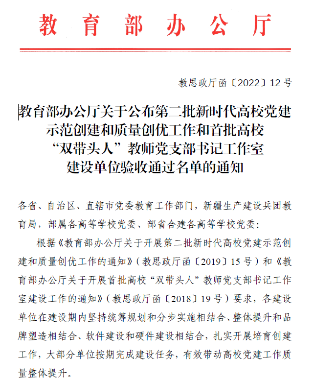 2022年6月8日,经建设单位对标自查总结、省级党委教育工作部门把关审核、教育部思想政治工作司审查、教育部政府门户网站公示,教育部印发《教育部办公厅关于公布第二批新时代高校党建示范创建和质量创优工作和首批高校“双带头人”教师党支部书记工作室建设单位验收通过名单的通知》,认定 9 个高校党委、98 个院系党组织、990个党支部、99 个“双带头人”工作室建设单位通过验收。浙江大学管理学院创新创业与战略学系教工党支部顺利通过教育部第二批“全国党建工作样板支部”建设单位验收。