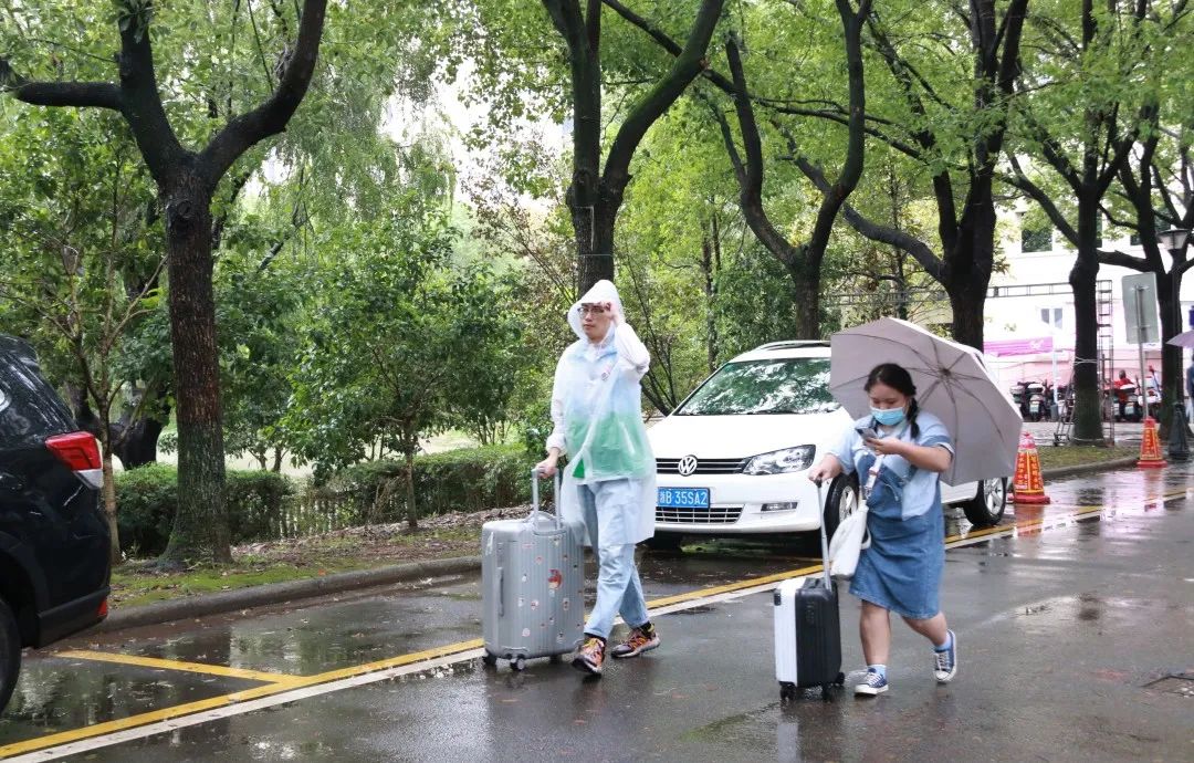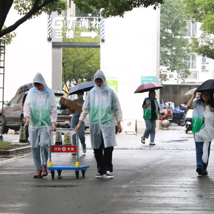 受台风“灿都”影响,宁波地区天气较差,新生报到期间阴雨连绵。9月14日,e党支部党员志愿服务站的学生党员和入党积极分子志愿者身穿志愿者服,外套雨衣,在学府东苑门口等候新生的到来,并以热情友善的态度和饱满的精神对待每一位新生,指引他们根据常态化疫情防控要求,完成体温检测、扫码登记、出示防疫行程卡与甬行码,省外人员则还需出示核酸报告。
