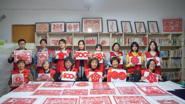另一边,塘塆书院党支部的部分学生又与社区老党员开展红色剪纸活动。社区剪纸艺术家毛金凤的剪纸颇有寓意。“大五角星表示祖国,中间这个五角星表示的是毛主席讲的‘中国人民站起来’;下面这个花表示的是邓小平讲的‘中国人民富来’;最后是习近平总书记讲的,我们祖国要强大,只有强大了才能抵抗外国侵略者的欺负。”