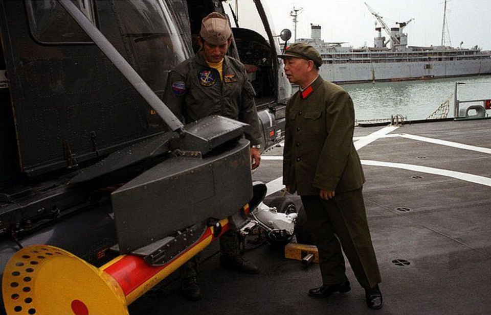 1980年,刘华清将军两次出访美国,在美国考察的最后一天,中国代表团连续参观了美国海军的福克斯号导弹巡洋舰、塔拉瓦号两栖攻击舰和小鹰号航空母舰。虽然美国海军接待隆重,礼遇甚高,但任何技术问题都不会给与回答。在参观美国航母时,只许看,摸都不让摸,于是留下了这样一张心酸的照片。