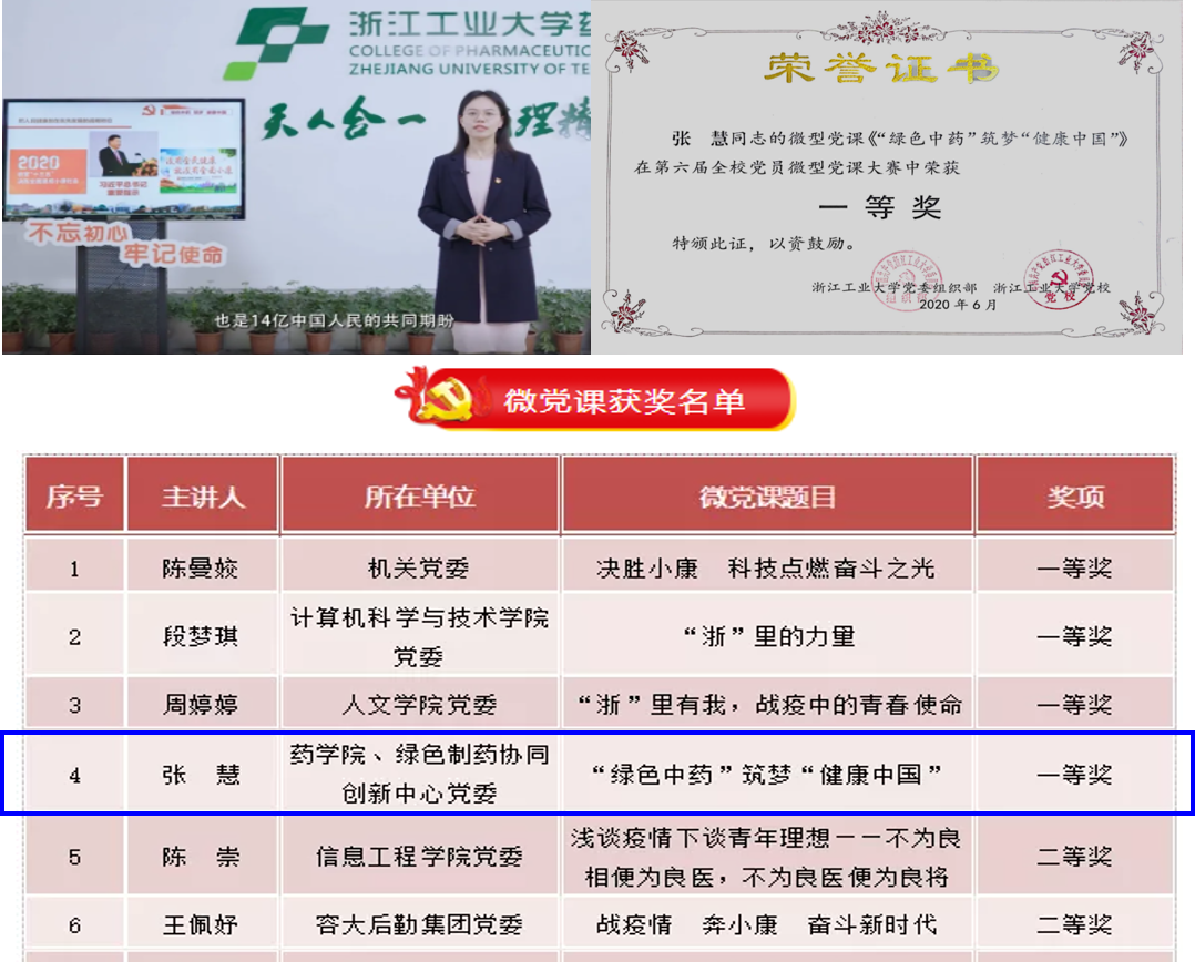 支部教职工党员张慧老师的微党课视频拍摄《“绿色中药”筑梦“健康中国”》在校第六届全校党员微型党课大赛荣获一等奖,为高校青年党员奋斗指明方向,号召高校师生决胜全面小康。