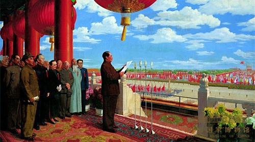《开国大典》油画(纵:405cm;横:230cm),描绘了1949年10月1日在天安门广场举行的中华人民共和国成立的盛大庆典。毛泽东在天安门城楼上宣读中央人民政府公告,宣告中华人民共和国成立的一刻。场面气势恢宏,喜庆气氛热烈。时任中国领导人,11位入画:中央人民政府主席毛泽东,副主席朱德、刘少奇、宋庆龄、李济深、张澜、高岗,政务院总理周恩来,副总理董必武、郭沫若,中央人民政府秘书长林伯渠。