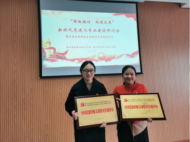 按照议程,财会金融学院党支部书记王茜与浙江经贸职业技术学院财务会计系教研室党支部书记共同签署结对共建协议,双方支部宣传委员互赠结对铭牌。随后,两个党支部书记分别就“全国高校党建样板支部”的创建进展情况和创新做法进行了交流。