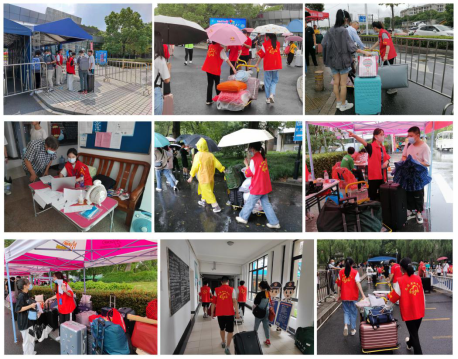 不管是周六秋老虎肆虐,还是周日台风影响带来大风大雨,每位党员志愿者始终以饱满的热情投入到迎新服务工作中去。财会金融学院党政领导班子积极发挥“勤心带头人”作用,带领党员们深入新生报到点和学生生活区,积极为新生引导报到流程、介绍学校分院概况、帮忙搬运沉重的行李,让初来乍到的新生更加安心和暖心,也让在校门外驻足目送的家长多了一份放心。一个个戴着党徽、身穿红色马甲、佩戴着党员先锋袖章的身影,在校园里形成了一道靓丽的风景线。