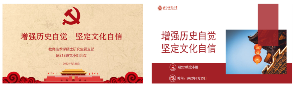 为了深入了解中华文明五千年发展史,推动把中国文明历史研究引向深入,引领全体党员增强历史自觉、坚定文化自信,教育技术学硕士党支部的各党小组分别召开“增强历史自觉,坚定文化自信”主题线上会议。