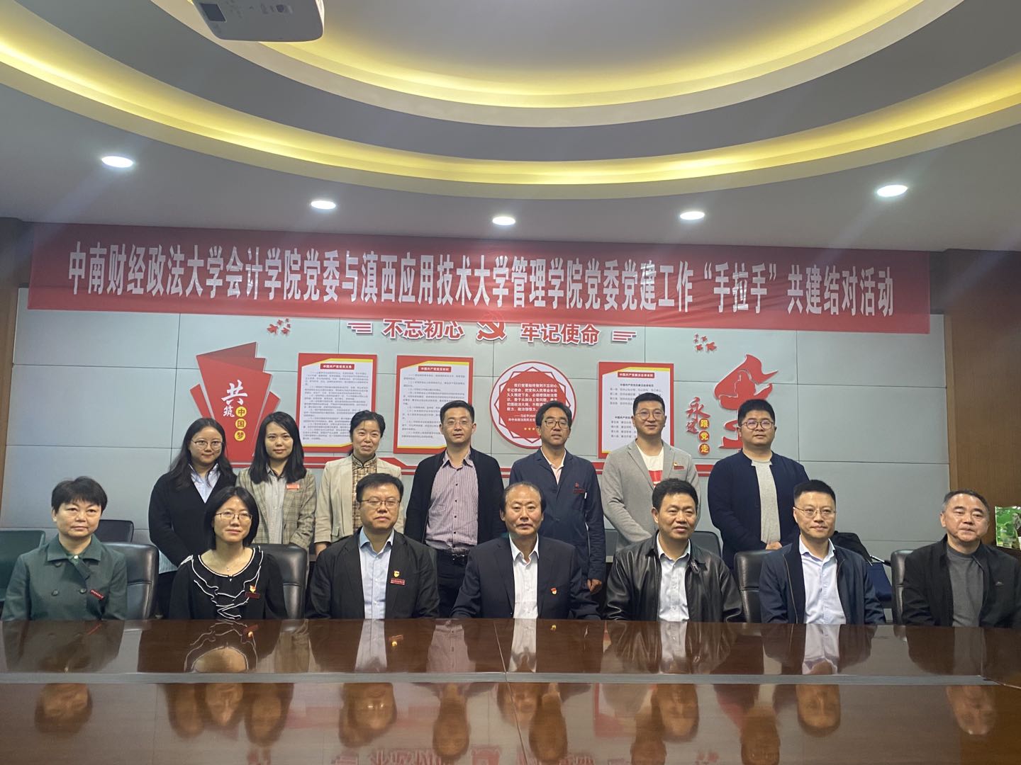 2021年4月16日,应会计学院党委邀请,滇西应用技术大学管理学院一行到中南财经政法大学与会计学院党委签订党建工作“手拉手”共建结对协议,本次会议由财务管理党支部书记,中南财经政法大学赴滇西应用技术大学挂职扶贫干部李四海教授主持,此工作为李四海书记挂职扶贫期间推动的两校、两院和两支部合作成果。