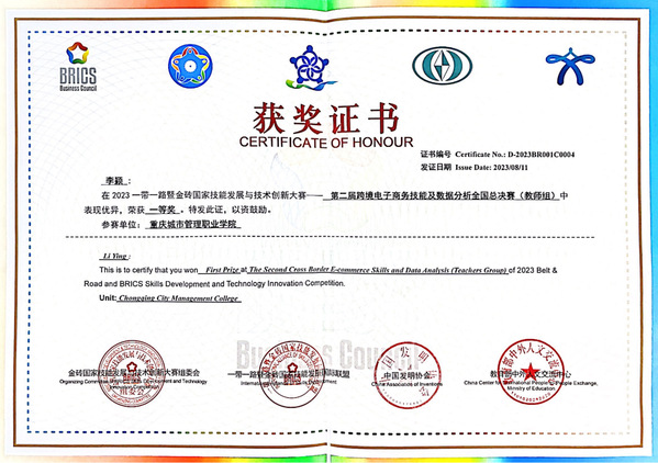 8月8日至11日,2023一带一路暨金砖国家技能发展与技术创新大赛之第二届跨境电子商务技能及数据分析赛项教师组全国总决赛在浙江金华举行。跨境电子商务技能与数据分析赛项作为金砖大赛的重要赛项已举办二届,今年已被列入全国普通高校大学生竞赛项目目录。赛项由金砖国家工商理事会、教育部中外人文交流中心等部门主办的国际赛事,国赛共有来自全国各省、直辖市、自治区的79名选手参加了此次比赛。我校跨境电子商务专业教师李颖荣获国赛一等奖,商务英语教师彭诗璇荣获国赛二等奖。组委会授予学校最佳组织奖,并聘请李颖老师为2023一带一路暨金砖国家技能发展与技术创新大赛技术委员会委员。