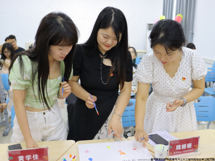 在DIY手指画趣味游戏中毕业生党员们纷纷发挥创意,用手指在画布上绘制出各种图案和色彩,摁下的手指印是他们为自己五年青春画下的句号,也是他们开启人生新阶段的开始。
