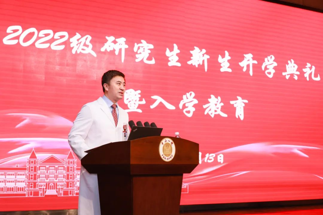 匡铭副院长向来自五湖四海的2022级研究生新同学表示热烈欢迎。他向同学们诠释了“敢为人先,崇尚学术,追求真理,学贯中西,天下为公”的中山一院精神,希望大家增强作为中山医人的志气、骨气和底气。