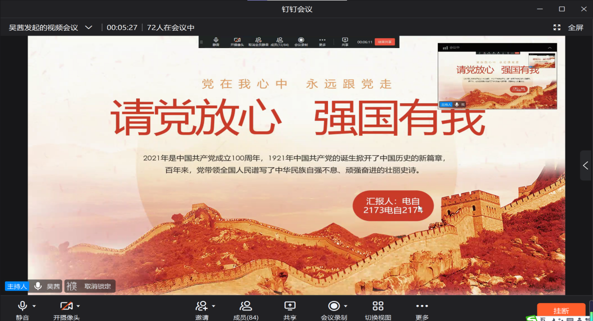 为深入学习贯彻习近平总书记“七一”重要讲话精神,教育引导学生坚定理想信念,大力发扬红色传统、传承红色基因。9月23日,电力工程学院开展了“请党放心,强国有我”线上主题团日活动,组织学习了习近平总书记在庆祝中国共产党成立100周年大会上的重要讲话精神。