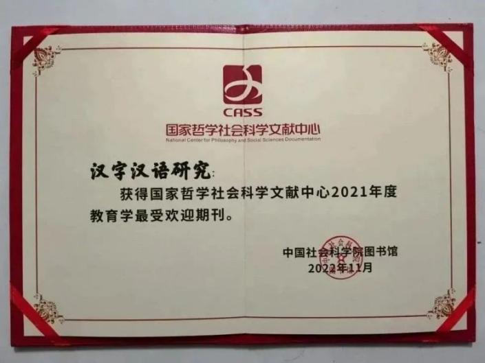 8.《汉字汉语研究》获评国家哲学社会科学文献中心“2021年度教育学最受欢迎期刊”